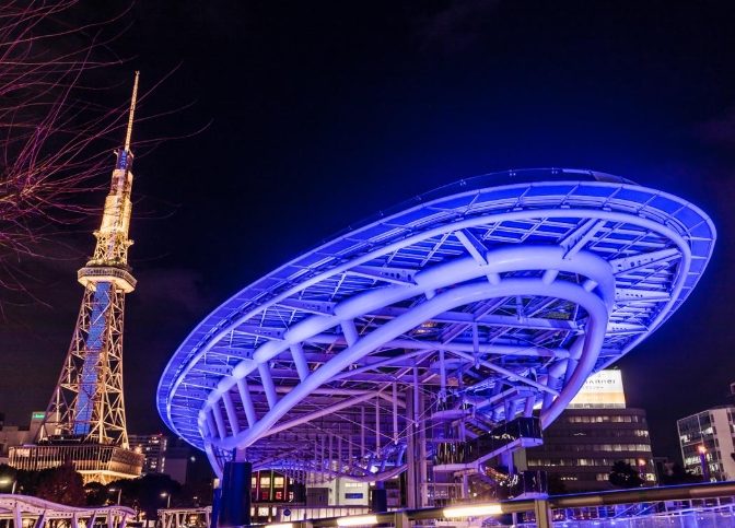 A: 首推 「名古屋電視塔」觀景臺!高度剛好,能把榮商圈燈火、Oasis 21的藍色水之光、以及遠方街景一網打盡(門票¥1000)。免費選擇則是走上「Oasis 21」的屋頂水之宇宙船步道,以電視塔為背景拍過去也很經典。如果預算夠,榮站附近的「モード學園スパイラルタワーズ」展望走廊(免費)視野更高更廣。