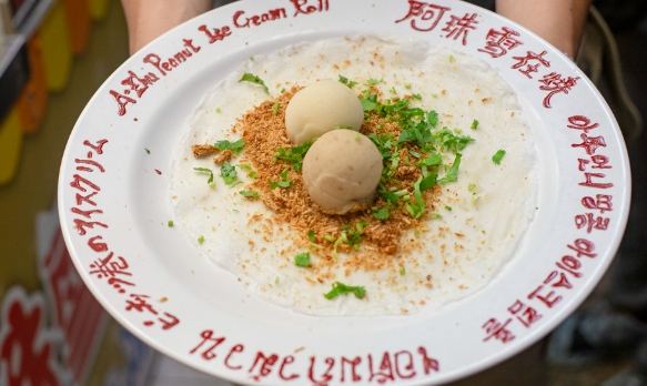 這個名字很特別吧?其實就是花生捲冰淇淋啦!潤餅皮鋪上滿滿的現刨花生糖粉,放兩球冰淇淋(通常有芋頭、鳳梨、百香果等口味),再加一點香菜。聽起來很怪?香菜配冰淇淋?但相信我,咬下去那個鹹香的花生粉、冰涼的冰淇淋、加上一點香菜提味,口感超妙的!甜甜鹹鹹又冰冰涼涼,在逛得滿身汗時來一卷,超解膩!不敢吃香菜記得先說。